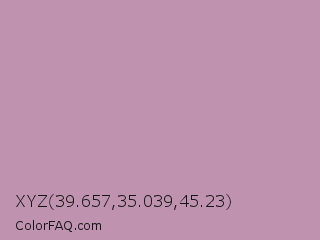 XYZ 39.657,35.039,45.23 Color is a light magenta color and the nearest color is Viola #cb8fa9. Hex code #bf93af and RGB value is rgb(191,147,175). In RGB color space, this color is composed of 75% red, 58% green, 69% blue, In CMYK color space, this color is composed of 0% cyan, 23% magenta, 8% yellow , 25% black , In HSL color space, this color has a hue angle of 322° , 26% saturation and 66% lightness.