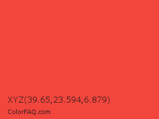 XYZ 39.65,23.594,6.879 Color is a normal red color and the nearest color is Carmine Pink #eb4c42. Hex code #f2463d and RGB value is rgb(242,70,61). In RGB color space, this color is composed of 95% red, 27% green, 24% blue, In CMYK color space, this color is composed of 0% cyan, 71% magenta, 75% yellow , 5% black , In HSL color space, this color has a hue angle of 3° , 87% saturation and 59% lightness.