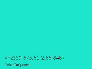 XYZ 39.675,61.2,66.848 Color is a normal cyan color and the nearest color is Turquoise PWG #30d5c8. Hex code #1ce6cc and RGB value is rgb(28,230,204). In RGB color space, this color is composed of 11% red, 90% green, 80% blue, In CMYK color space, this color is composed of 88% cyan, 0% magenta, 11% yellow , 10% black , In HSL color space, this color has a hue angle of 172° , 80% saturation and 51% lightness.