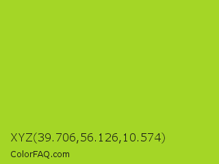 XYZ 39.706,56.126,10.574 Color is a normal lime color and the nearest color is Atlantis #97cd2d. Hex code #a4d626 and RGB value is rgb(164,214,38). In RGB color space, this color is composed of 64% red, 84% green, 15% blue, In CMYK color space, this color is composed of 23% cyan, 0% magenta, 82% yellow , 16% black , In HSL color space, this color has a hue angle of 77° , 70% saturation and 49% lightness.