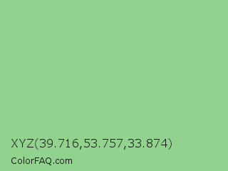 XYZ 39.716,53.757,33.874 Color is a light green color and the nearest color is Feijoa #9fdd8c. Hex code #93d18e and RGB value is rgb(147,209,142). In RGB color space, this color is composed of 58% red, 82% green, 56% blue, In CMYK color space, this color is composed of 30% cyan, 0% magenta, 32% yellow , 18% black , In HSL color space, this color has a hue angle of 116° , 42% saturation and 69% lightness.