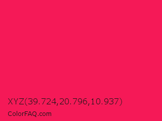 XYZ 39.724,20.796,10.937 Color is a normal rose color and the nearest color is Awesome #ff2052. Hex code #f51957 and RGB value is rgb(245,25,87). In RGB color space, this color is composed of 96% red, 10% green, 34% blue, In CMYK color space, this color is composed of 0% cyan, 90% magenta, 64% yellow , 4% black , In HSL color space, this color has a hue angle of 343° , 92% saturation and 53% lightness.