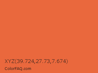 XYZ 39.724,27.73,7.674 Color is a normal color and the nearest color is Red Damask #da6a41. Hex code #ea683d and RGB value is rgb(234,104,61). In RGB color space, this color is composed of 92% red, 41% green, 24% blue, In CMYK color space, this color is composed of 0% cyan, 56% magenta, 74% yellow , 8% black , In HSL color space, this color has a hue angle of 15° , 80% saturation and 58% lightness.