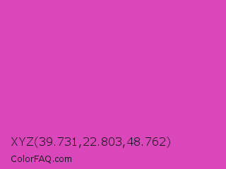 XYZ 39.731,22.803,48.762 Color is a normal magenta color and the nearest color is Fuchsia Pink #c154c1. Hex code #d947ba and RGB value is rgb(217,71,186). In RGB color space, this color is composed of 85% red, 28% green, 73% blue, In CMYK color space, this color is composed of 0% cyan, 67% magenta, 14% yellow , 15% black , In HSL color space, this color has a hue angle of 313° , 66% saturation and 56% lightness.