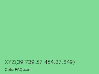 XYZ 39.739,57.454,37.849 Color is a light green color and the nearest color is Light Green #90ee90. Hex code #80db96 and RGB value is rgb(128,219,150). In RGB color space, this color is composed of 50% red, 86% green, 59% blue, In CMYK color space, this color is composed of 42% cyan, 0% magenta, 32% yellow , 14% black , In HSL color space, this color has a hue angle of 135° , 56% saturation and 68% lightness.