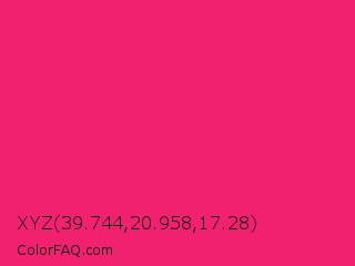 XYZ 39.744,20.958,17.28 Color is a normal rose color and the nearest color is Razzmatazz #e3256b. Hex code #f12170 and RGB value is rgb(241,33,112). In RGB color space, this color is composed of 95% red, 13% green, 44% blue, In CMYK color space, this color is composed of 0% cyan, 86% magenta, 54% yellow , 5% black , In HSL color space, this color has a hue angle of 337° , 88% saturation and 54% lightness.
