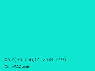 XYZ 39.756,61.2,68.749 Color is a normal cyan color and the nearest color is Bright Turquoise #08e8de. Hex code #0fe6cf and RGB value is rgb(15,230,207). In RGB color space, this color is composed of 6% red, 90% green, 81% blue, In CMYK color space, this color is composed of 93% cyan, 0% magenta, 10% yellow , 10% black , In HSL color space, this color has a hue angle of 174° , 88% saturation and 48% lightness.
