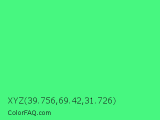 XYZ 39.756,69.42,31.726 Color is a light green color and the nearest color is Very Light Malachite Green #64e986. Hex code #47f780 and RGB value is rgb(71,247,128). In RGB color space, this color is composed of 28% red, 97% green, 50% blue, In CMYK color space, this color is composed of 71% cyan, 0% magenta, 48% yellow , 3% black , In HSL color space, this color has a hue angle of 139° , 92% saturation and 62% lightness.