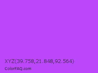 XYZ 39.758,21.848,92.564 Color is a light purple color and the nearest color is Medium Orchid #ba55d3. Hex code #ba47fa and RGB value is rgb(186,71,250). In RGB color space, this color is composed of 73% red, 28% green, 98% blue, In CMYK color space, this color is composed of 26% cyan, 72% magenta, 0% yellow , 2% black , In HSL color space, this color has a hue angle of 279° , 95% saturation and 63% lightness.