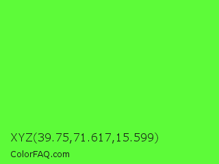 XYZ 39.75,71.617,15.599 Color is a normal green color and the nearest color is Spring Frost #87ff2a. Hex code #5dfb39 and RGB value is rgb(93,251,57). In RGB color space, this color is composed of 36% red, 98% green, 22% blue, In CMYK color space, this color is composed of 63% cyan, 0% magenta, 77% yellow , 2% black , In HSL color space, this color has a hue angle of 109° , 96% saturation and 60% lightness.
