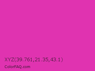 XYZ 39.761,21.35,43.1 Color is a normal magenta color and the nearest color is Frostbite #e936a7. Hex code #e033b0 and RGB value is rgb(224,51,176). In RGB color space, this color is composed of 88% red, 20% green, 69% blue, In CMYK color space, this color is composed of 0% cyan, 77% magenta, 21% yellow , 12% black , In HSL color space, this color has a hue angle of 317° , 74% saturation and 54% lightness.
