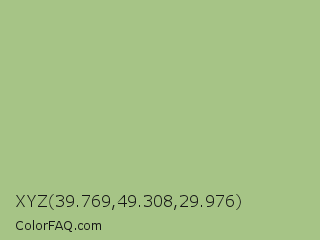 XYZ 39.769,49.308,29.976 Color is a light green color and the nearest color is Swamp Green #acb78e. Hex code #a6c486 and RGB value is rgb(166,196,134). In RGB color space, this color is composed of 65% red, 77% green, 53% blue, In CMYK color space, this color is composed of 15% cyan, 0% magenta, 32% yellow , 23% black , In HSL color space, this color has a hue angle of 89° , 34% saturation and 65% lightness.