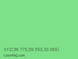 XYZ 39.775,59.553,33.065 Color is a light green color and the nearest color is Pastel Green #77dd77. Hex code #7ee089 and RGB value is rgb(126,224,137). In RGB color space, this color is composed of 49% red, 88% green, 54% blue, In CMYK color space, this color is composed of 44% cyan, 0% magenta, 39% yellow , 12% black , In HSL color space, this color has a hue angle of 127° , 61% saturation and 69% lightness.