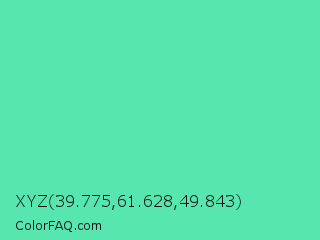 XYZ 39.775,61.628,49.843 Color is a light green color and the nearest color is Medium Aquamarine #66ddaa. Hex code #56e6ae and RGB value is rgb(86,230,174). In RGB color space, this color is composed of 34% red, 90% green, 68% blue, In CMYK color space, this color is composed of 63% cyan, 0% magenta, 24% yellow , 10% black , In HSL color space, this color has a hue angle of 157° , 74% saturation and 62% lightness.