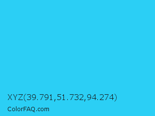XYZ 39.791,51.732,94.274 Color is a normal cyan color and the nearest color is Spiro Disco Ball #0fc0fc. Hex code #2bcff5 and RGB value is rgb(43,207,245). In RGB color space, this color is composed of 17% red, 81% green, 96% blue, In CMYK color space, this color is composed of 82% cyan, 16% magenta, 0% yellow , 4% black , In HSL color space, this color has a hue angle of 191° , 91% saturation and 56% lightness.