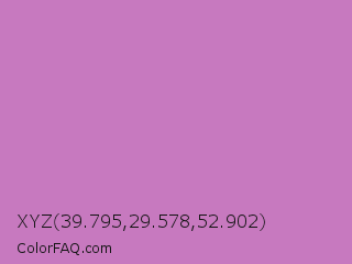 XYZ 39.795,29.578,52.902 Color is a light magenta color and the nearest color is Sky Magenta #cf71af. Hex code #c779bf and RGB value is rgb(199,121,191). In RGB color space, this color is composed of 78% red, 47% green, 75% blue, In CMYK color space, this color is composed of 0% cyan, 39% magenta, 4% yellow , 22% black , In HSL color space, this color has a hue angle of 306° , 41% saturation and 63% lightness.
