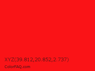 XYZ 39.812,20.852,2.737 Color is a normal red color and the nearest color is Vivid Red #f70d1a. Hex code #fa1317 and RGB value is rgb(250,19,23). In RGB color space, this color is composed of 98% red, 7% green, 9% blue, In CMYK color space, this color is composed of 0% cyan, 92% magenta, 91% yellow , 2% black , In HSL color space, this color has a hue angle of 359° , 96% saturation and 53% lightness.