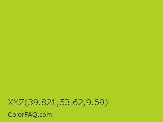 XYZ 39.821,53.62,9.69 Color is a normal lime color and the nearest color is Acid Green #b0bf1a. Hex code #adcf21 and RGB value is rgb(173,207,33). In RGB color space, this color is composed of 68% red, 81% green, 13% blue, In CMYK color space, this color is composed of 16% cyan, 0% magenta, 84% yellow , 19% black , In HSL color space, this color has a hue angle of 72° , 73% saturation and 47% lightness.