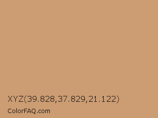 XYZ 39.828,37.829,21.122 Color is a light orange color and the nearest color is Antique Brass #cd9575. Hex code #cc9c72 and RGB value is rgb(204,156,114). In RGB color space, this color is composed of 80% red, 61% green, 45% blue, In CMYK color space, this color is composed of 0% cyan, 24% magenta, 44% yellow , 20% black , In HSL color space, this color has a hue angle of 28° , 47% saturation and 62% lightness.