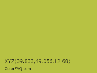 XYZ 39.833,49.056,12.68 Color is a normal yellow color and the nearest color is Turmeric #cabb48. Hex code #b7c243 and RGB value is rgb(183,194,67). In RGB color space, this color is composed of 72% red, 76% green, 26% blue, In CMYK color space, this color is composed of 6% cyan, 0% magenta, 65% yellow , 24% black , In HSL color space, this color has a hue angle of 65° , 51% saturation and 51% lightness.