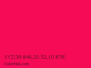 XYZ 39.846,20.52,10.878 Color is a normal rose color and the nearest color is Folly #ff004f. Hex code #f60b57 and RGB value is rgb(246,11,87). In RGB color space, this color is composed of 96% red, 4% green, 34% blue, In CMYK color space, this color is composed of 0% cyan, 96% magenta, 65% yellow , 4% black , In HSL color space, this color has a hue angle of 341° , 93% saturation and 50% lightness.