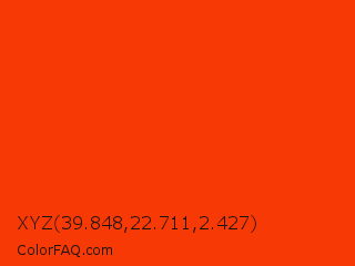 XYZ 39.848,22.711,2.427 Color is a normal red color and the nearest color is Coquelicot #ff3800. Hex code #f73905 and RGB value is rgb(247,57,5). In RGB color space, this color is composed of 97% red, 22% green, 2% blue, In CMYK color space, this color is composed of 0% cyan, 77% magenta, 98% yellow , 3% black , In HSL color space, this color has a hue angle of 13° , 96% saturation and 49% lightness.