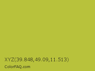 XYZ 39.848,49.09,11.513 Color is a normal yellow color and the nearest color is Earls Green #c9b93b. Hex code #b8c23b and RGB value is rgb(184,194,59). In RGB color space, this color is composed of 72% red, 76% green, 23% blue, In CMYK color space, this color is composed of 5% cyan, 0% magenta, 70% yellow , 24% black , In HSL color space, this color has a hue angle of 64° , 53% saturation and 50% lightness.