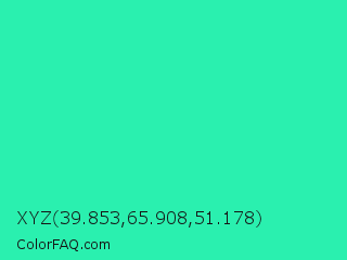 XYZ 39.853,65.908,51.178 Color is a normal green color and the nearest color is Eucalyptus #44d7a8. Hex code #2af0af and RGB value is rgb(42,240,175). In RGB color space, this color is composed of 16% red, 94% green, 69% blue, In CMYK color space, this color is composed of 83% cyan, 0% magenta, 27% yellow , 6% black , In HSL color space, this color has a hue angle of 160° , 87% saturation and 55% lightness.
