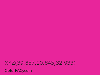 XYZ 39.857,20.845,32.933 Color is a normal magenta color and the nearest color is Barbie Pink #e0218a. Hex code #e8259b and RGB value is rgb(232,37,155). In RGB color space, this color is composed of 91% red, 15% green, 61% blue, In CMYK color space, this color is composed of 0% cyan, 84% magenta, 33% yellow , 9% black , In HSL color space, this color has a hue angle of 324° , 81% saturation and 53% lightness.