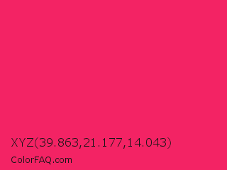 XYZ 39.863,21.177,14.043 Color is a normal rose color and the nearest color is Razzmatazz #e3256b. Hex code #f32364 and RGB value is rgb(243,35,100). In RGB color space, this color is composed of 95% red, 14% green, 39% blue, In CMYK color space, this color is composed of 0% cyan, 86% magenta, 59% yellow , 5% black , In HSL color space, this color has a hue angle of 341° , 90% saturation and 55% lightness.
