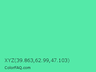XYZ 39.863,62.99,47.103 Color is a light green color and the nearest color is Medium Aquamarine #66ddaa. Hex code #54e9a8 and RGB value is rgb(84,233,168). In RGB color space, this color is composed of 33% red, 91% green, 66% blue, In CMYK color space, this color is composed of 64% cyan, 0% magenta, 28% yellow , 9% black , In HSL color space, this color has a hue angle of 154° , 77% saturation and 62% lightness.