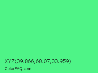 XYZ 39.866,68.07,33.959 Color is a light green color and the nearest color is Very Light Malachite Green #64e986. Hex code #4ef487 and RGB value is rgb(78,244,135). In RGB color space, this color is composed of 31% red, 96% green, 53% blue, In CMYK color space, this color is composed of 68% cyan, 0% magenta, 45% yellow , 4% black , In HSL color space, this color has a hue angle of 141° , 88% saturation and 63% lightness.
