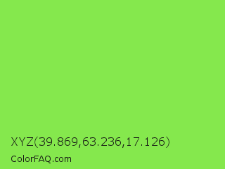 XYZ 39.869,63.236,17.126 Color is a light green color and the nearest color is Kiwi #8ee53f. Hex code #85e84d and RGB value is rgb(133,232,77). In RGB color space, this color is composed of 52% red, 91% green, 30% blue, In CMYK color space, this color is composed of 43% cyan, 0% magenta, 67% yellow , 9% black , In HSL color space, this color has a hue angle of 98° , 77% saturation and 61% lightness.