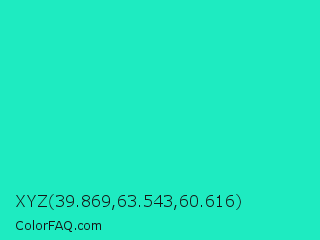 XYZ 39.869,63.543,60.616 Color is a normal cyan color and the nearest color is Turquoise PWG #30d5c8. Hex code #1eebc1 and RGB value is rgb(30,235,193). In RGB color space, this color is composed of 12% red, 92% green, 76% blue, In CMYK color space, this color is composed of 87% cyan, 0% magenta, 18% yellow , 8% black , In HSL color space, this color has a hue angle of 168° , 84% saturation and 52% lightness.