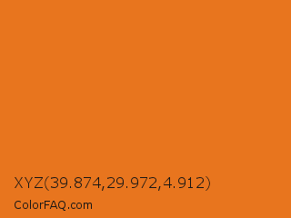 XYZ 39.874,29.972,4.912 Color is a normal orange color and the nearest color is Tango #ed7a1c. Hex code #e8751e and RGB value is rgb(232,117,30). In RGB color space, this color is composed of 91% red, 46% green, 12% blue, In CMYK color space, this color is composed of 0% cyan, 50% magenta, 87% yellow , 9% black , In HSL color space, this color has a hue angle of 26° , 81% saturation and 51% lightness.