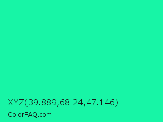 XYZ 39.889,68.24,47.146 Color is a normal green color and the nearest color is Medium Spring Green #00fa9a. Hex code #17f5a6 and RGB value is rgb(23,245,166). In RGB color space, this color is composed of 9% red, 96% green, 65% blue, In CMYK color space, this color is composed of 91% cyan, 0% magenta, 32% yellow , 4% black , In HSL color space, this color has a hue angle of 159° , 92% saturation and 53% lightness.