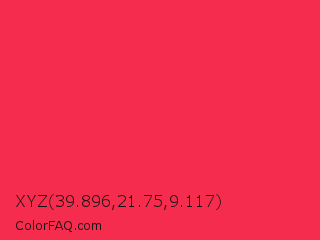XYZ 39.896,21.75,9.117 Color is a normal red color and the nearest color is Red Crayola #ee204d. Hex code #f52c4d and RGB value is rgb(245,44,77). In RGB color space, this color is composed of 96% red, 17% green, 30% blue, In CMYK color space, this color is composed of 0% cyan, 82% magenta, 69% yellow , 4% black , In HSL color space, this color has a hue angle of 350° , 91% saturation and 57% lightness.