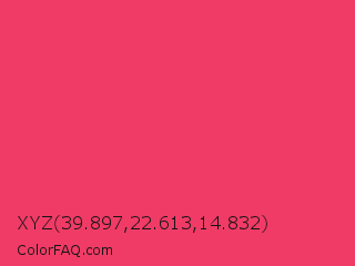 XYZ 39.897,22.613,14.832 Color is a normal red color and the nearest color is Paradise Pink #e63e62. Hex code #f03b66 and RGB value is rgb(240,59,102). In RGB color space, this color is composed of 94% red, 23% green, 40% blue, In CMYK color space, this color is composed of 0% cyan, 75% magenta, 58% yellow , 6% black , In HSL color space, this color has a hue angle of 346° , 86% saturation and 59% lightness.