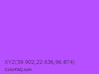 XYZ 39.902,22.636,96.874 Color is a light purple color and the nearest color is Navy Purple #9457eb. Hex code #b54fff and RGB value is rgb(181,79,255). In RGB color space, this color is composed of 71% red, 31% green, 100% blue, In CMYK color space, this color is composed of 29% cyan, 69% magenta, 0% yellow , 0% black , In HSL color space, this color has a hue angle of 275° , 100% saturation and 65% lightness.