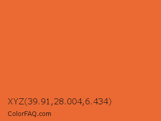 XYZ 39.91,28.004,6.434 Color is a normal orange color and the nearest color is Deep Carrot Orange #e9692c. Hex code #eb6933 and RGB value is rgb(235,105,51). In RGB color space, this color is composed of 92% red, 41% green, 20% blue, In CMYK color space, this color is composed of 0% cyan, 55% magenta, 78% yellow , 8% black , In HSL color space, this color has a hue angle of 18° , 82% saturation and 56% lightness.