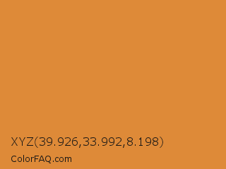 XYZ 39.926,33.992,8.198 Color is a normal orange color and the nearest color is Tigers Eye #e08d3c. Hex code #de8a38 and RGB value is rgb(222,138,56). In RGB color space, this color is composed of 87% red, 54% green, 22% blue, In CMYK color space, this color is composed of 0% cyan, 38% magenta, 75% yellow , 13% black , In HSL color space, this color has a hue angle of 30° , 72% saturation and 55% lightness.