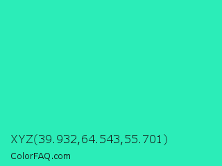 XYZ 39.932,64.543,55.701 Color is a normal cyan color and the nearest color is Turquoise PWG #30d5c8. Hex code #2bedb8 and RGB value is rgb(43,237,184). In RGB color space, this color is composed of 17% red, 93% green, 72% blue, In CMYK color space, this color is composed of 82% cyan, 0% magenta, 22% yellow , 7% black , In HSL color space, this color has a hue angle of 164° , 84% saturation and 55% lightness.