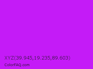 XYZ 39.945,19.235,89.603 Color is a normal purple color and the nearest color is Vivid Mulberry #b80ce3. Hex code #c41bf7 and RGB value is rgb(196,27,247). In RGB color space, this color is composed of 77% red, 11% green, 97% blue, In CMYK color space, this color is composed of 21% cyan, 89% magenta, 0% yellow , 3% black , In HSL color space, this color has a hue angle of 286° , 93% saturation and 54% lightness.