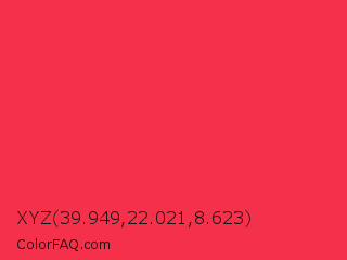 XYZ 39.949,22.021,8.623 Color is a normal red color and the nearest color is Red Salsa #fd3a4a. Hex code #f5304a and RGB value is rgb(245,48,74). In RGB color space, this color is composed of 96% red, 19% green, 29% blue, In CMYK color space, this color is composed of 0% cyan, 80% magenta, 70% yellow , 4% black , In HSL color space, this color has a hue angle of 352° , 91% saturation and 57% lightness.