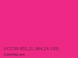 XYZ 39.952,21.284,24.193 Color is a normal rose color and the nearest color is Barbie Pink #e0218a. Hex code #ed2985 and RGB value is rgb(237,41,133). In RGB color space, this color is composed of 93% red, 16% green, 52% blue, In CMYK color space, this color is composed of 0% cyan, 83% magenta, 44% yellow , 7% black , In HSL color space, this color has a hue angle of 332° , 84% saturation and 55% lightness.