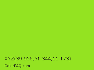 XYZ 39.956,61.344,11.173 Color is a normal green color and the nearest color is Atlantis #97cd2d. Hex code #94e321 and RGB value is rgb(148,227,33). In RGB color space, this color is composed of 58% red, 89% green, 13% blue, In CMYK color space, this color is composed of 35% cyan, 0% magenta, 85% yellow , 11% black , In HSL color space, this color has a hue angle of 84° , 78% saturation and 51% lightness.