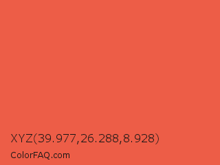 XYZ 39.977,26.288,8.928 Color is a normal red color and the nearest color is Orange Soda #fa5b3d. Hex code #ed5d47 and RGB value is rgb(237,93,71). In RGB color space, this color is composed of 93% red, 36% green, 28% blue, In CMYK color space, this color is composed of 0% cyan, 61% magenta, 70% yellow , 7% black , In HSL color space, this color has a hue angle of 8° , 82% saturation and 60% lightness.