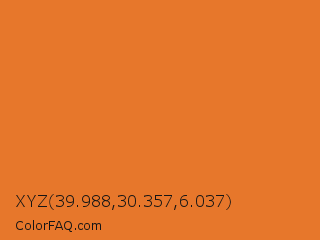 XYZ 39.988,30.357,6.037 Color is a normal orange color and the nearest color is Vivid Tangelo #f07427. Hex code #e7772b and RGB value is rgb(231,119,43). In RGB color space, this color is composed of 91% red, 47% green, 17% blue, In CMYK color space, this color is composed of 0% cyan, 48% magenta, 81% yellow , 9% black , In HSL color space, this color has a hue angle of 24° , 80% saturation and 54% lightness.