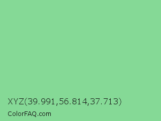 XYZ 39.991,56.814,37.713 Color is a light green color and the nearest color is Light Green #90ee90. Hex code #85d996 and RGB value is rgb(133,217,150). In RGB color space, this color is composed of 52% red, 85% green, 59% blue, In CMYK color space, this color is composed of 39% cyan, 0% magenta, 31% yellow , 15% black , In HSL color space, this color has a hue angle of 132° , 53% saturation and 69% lightness.