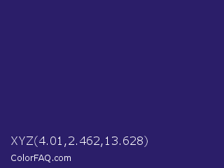 XYZ 4.01,2.462,13.628 Color is a dark indigo color and the nearest color is Lucky Point #1a1a68. Hex code #2b1e69 and RGB value is rgb(43,30,105). In RGB color space, this color is composed of 17% red, 12% green, 41% blue, In CMYK color space, this color is composed of 59% cyan, 71% magenta, 0% yellow , 59% black , In HSL color space, this color has a hue angle of 250° , 56% saturation and 26% lightness.